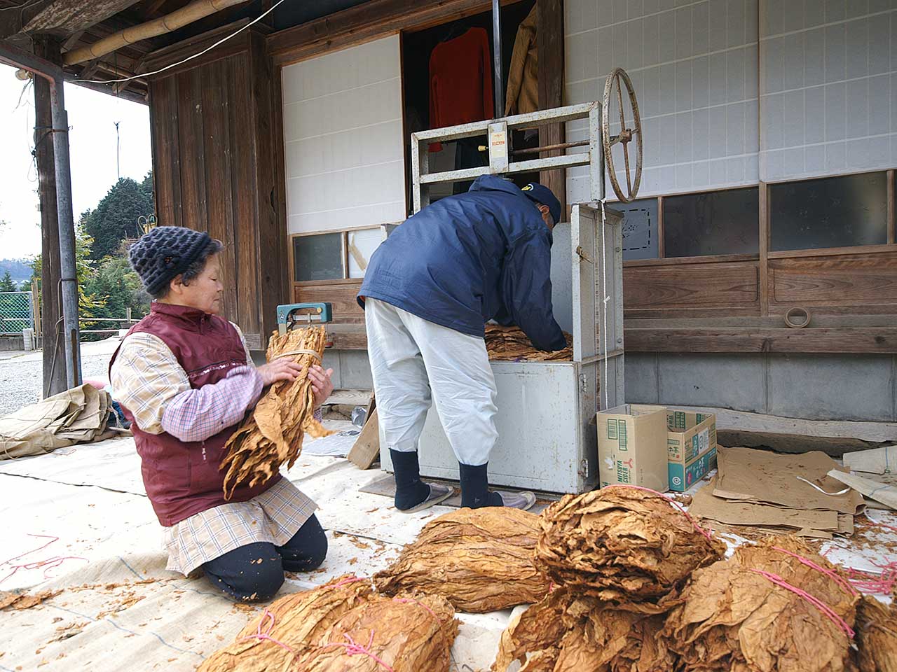 黄色種は35~72℃という高温で乾燥させるが、阿波葉は自然乾燥。梅雨時などで低湿なときは薪ストーブで加温することもあるが30℃を超えないように管理する。