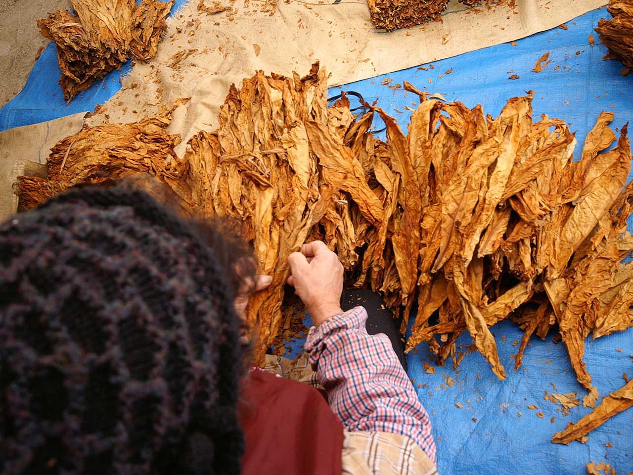 「調理」という工程を見せてもらう。完全に色づいたタバコの葉を品質ごとに分類したり、縮れた葉を伸ばしたりする作業だ。