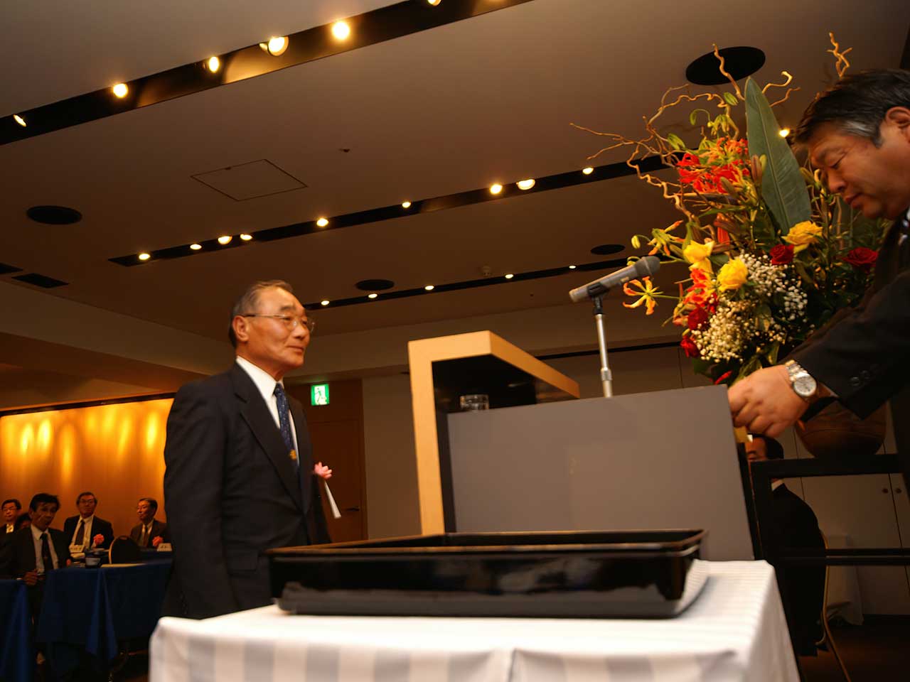 徳島県知事が謝辞を述ているところ。吉野川可動堰問題で荒れた県政をまとめるために保守勢力に推されて知事になった人だが、官僚出身だけあってすごく頭がいい人だ。阿波葉の歴史や生産量などの数字をふまえた演説をいっさいカンペを見ずに、常に客席に視線を送りながら我がことのようにしゃべり切った。