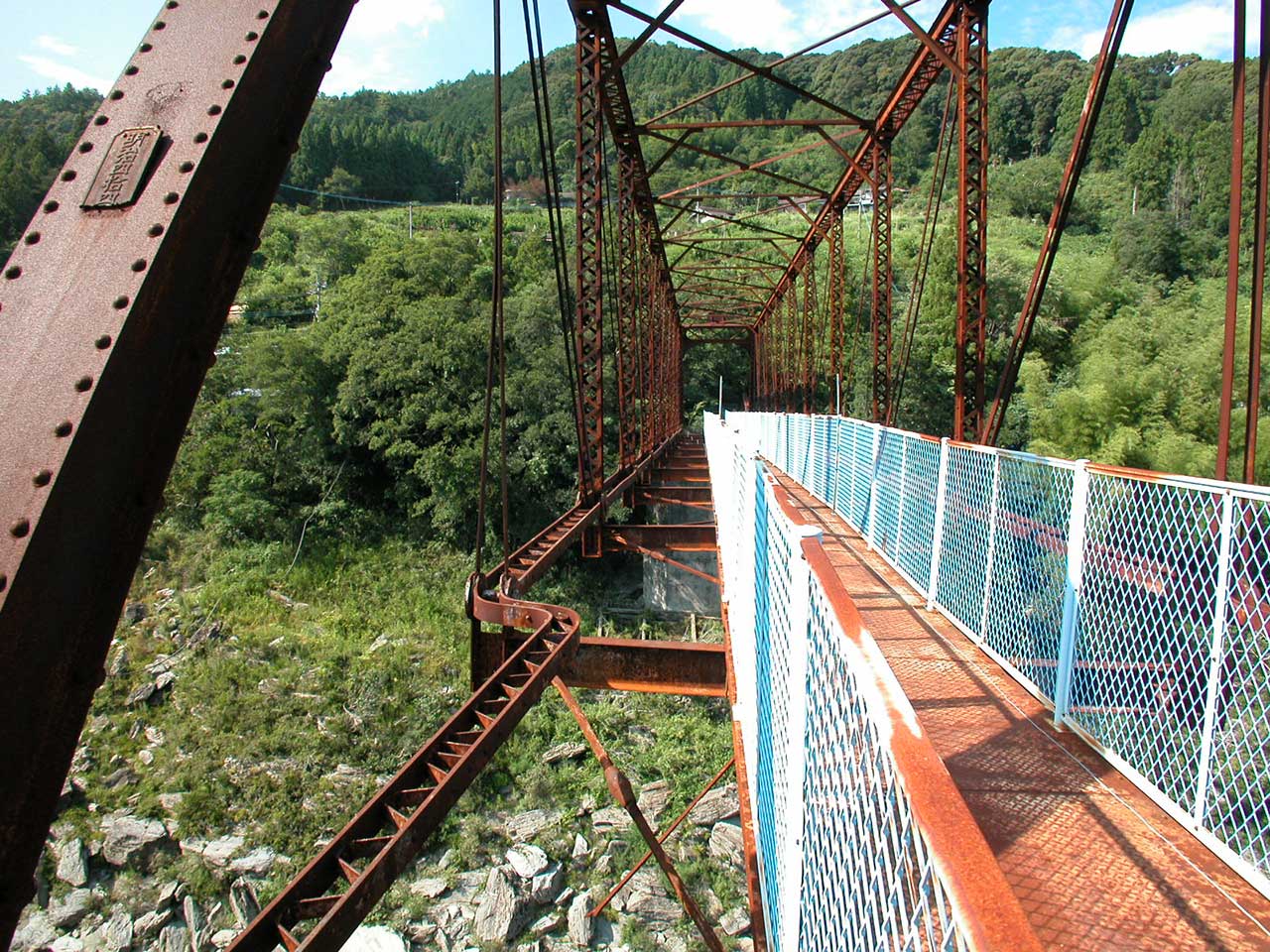 でもまあ、最近まで使われていた感じだし、まだ橋床も欄干もしっかりしていて、渡る→即死、って状態ではない。