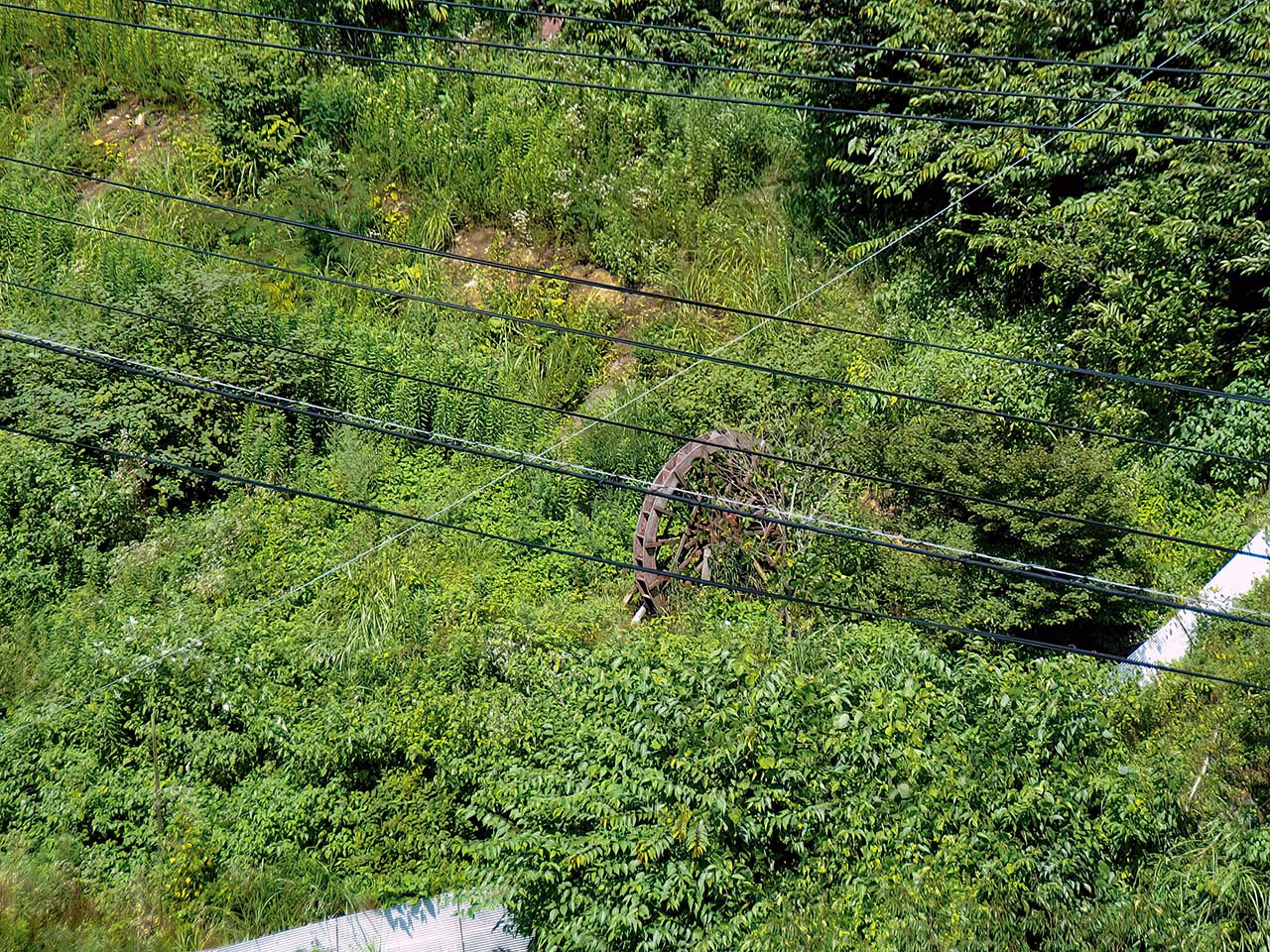 水輪がある斜面は雑草に覆われた荒れ地だが、あずまやが見えるので元はキャンプ場か公園だったのではないかと思われる。