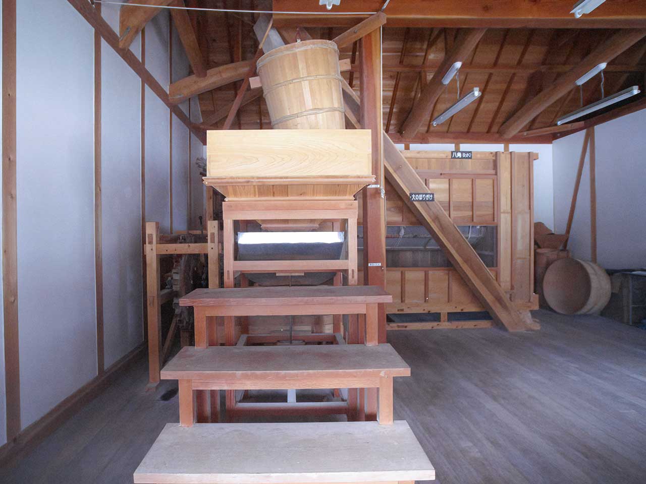 手前の階段の上の木製の枡には「元掛機」というプレートがついている。最初の原料を投入するホッパーではないかと思われる。ここから少しずつ原料が石臼に流し込まれる。