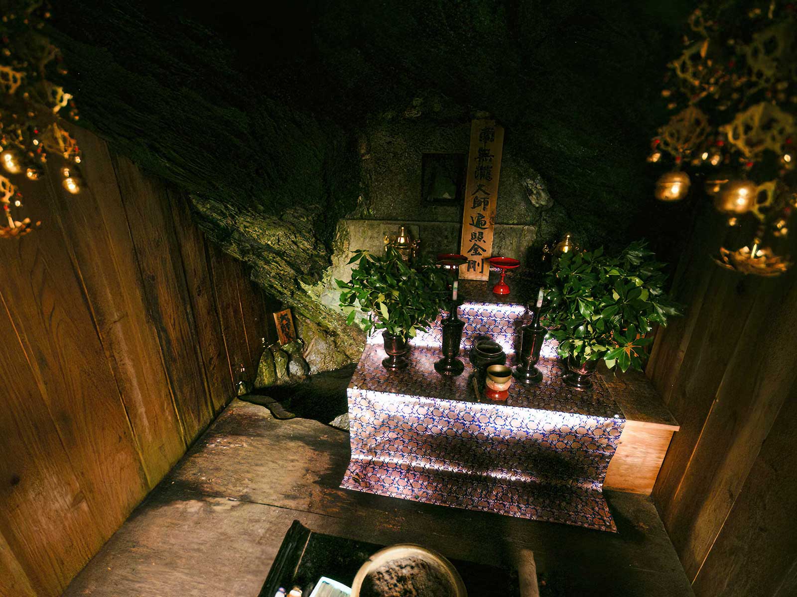 内部には「大師泉」という湧き水があり、レリーフ状の弘法大師が祀られている。