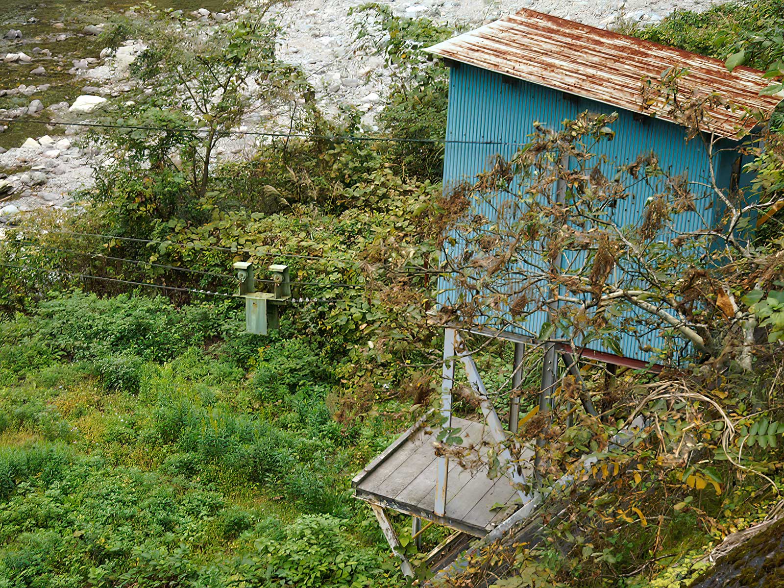 架線はほぼ水平に張られている。林業に関連するものではなく、この測水設備に関係する索道と思われる。対岸には石垣があるから古い時代には山仕事をする人が渡った場所かもしれないが、現代では人家などもなく、対岸に何らかの用事があるとは思えない。