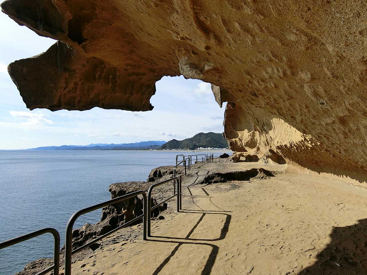 これ、海食洞ではなくて、たぶん遊歩道のために掘削した人口の穴だと思う。