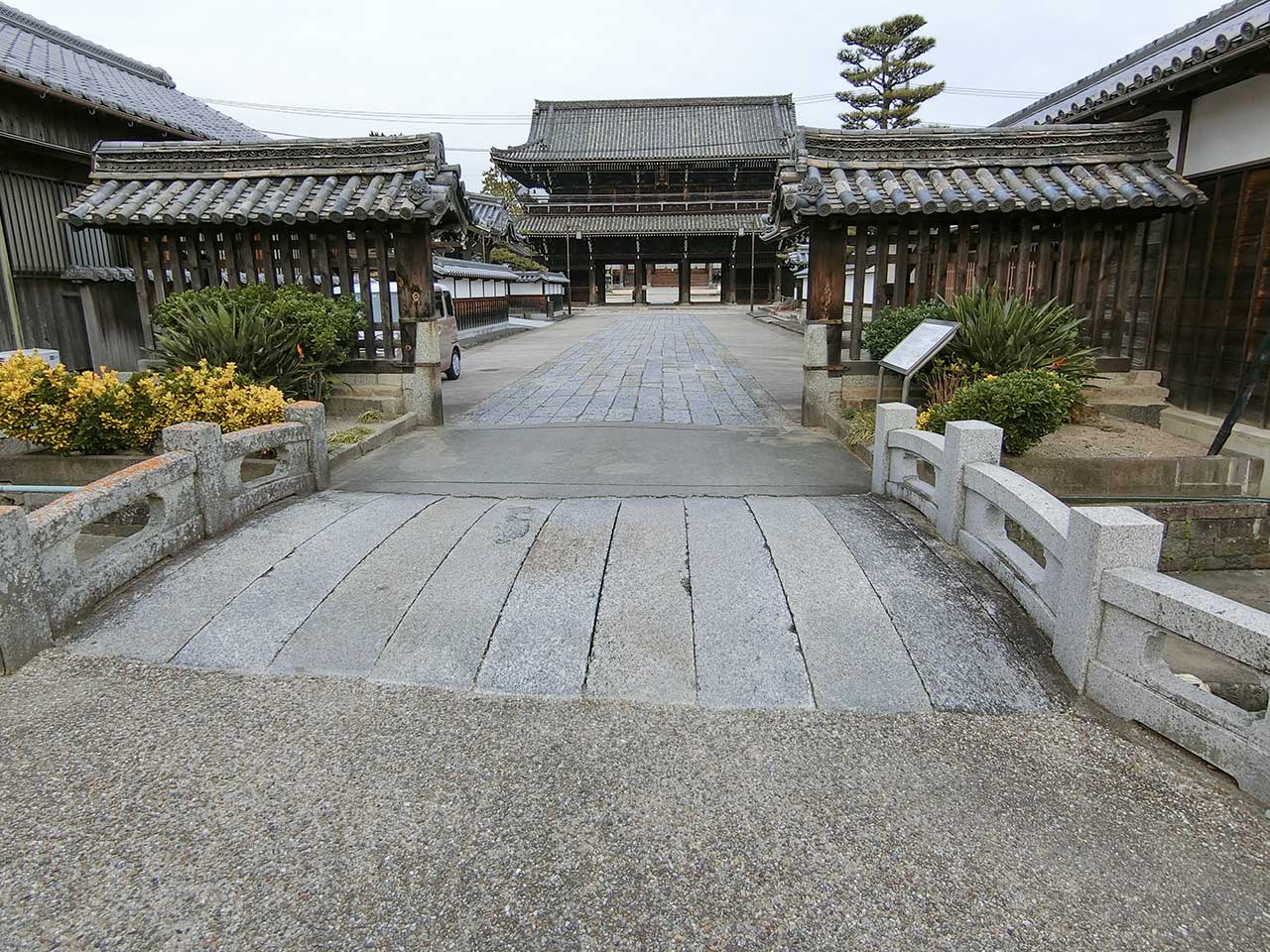 古地図で山門の正面に描かれている反り橋。ここには東西に小さな川がいまもある。川を渡ったところの柵は、復元かもしれないが、とにかく寺内町に入るにはこのようなゲートを通過しなければならなかった。
