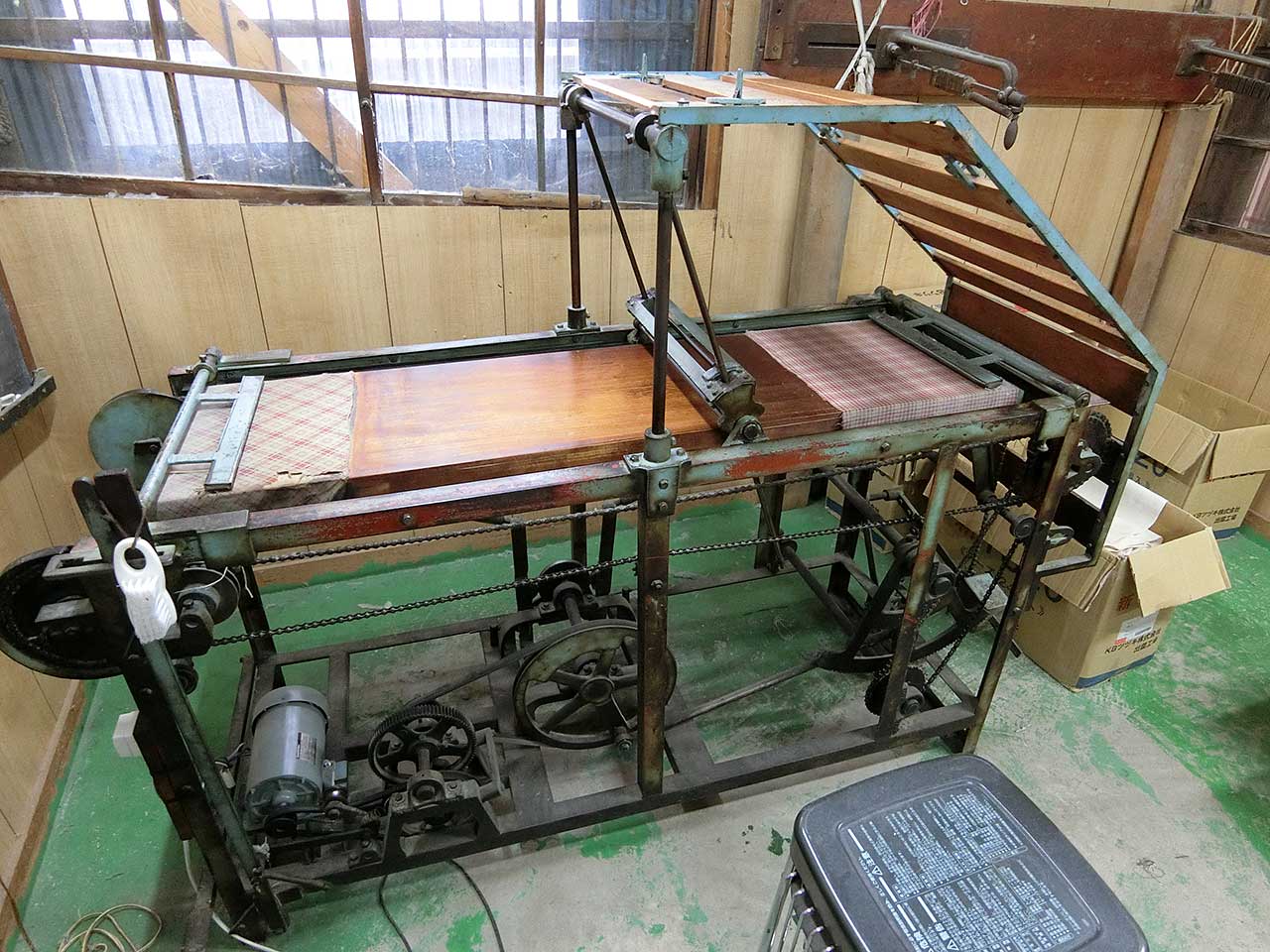 確か、男巻きに巻かれたロール状の布を、一定の長さで折り畳むための機械という説明だったと思う。