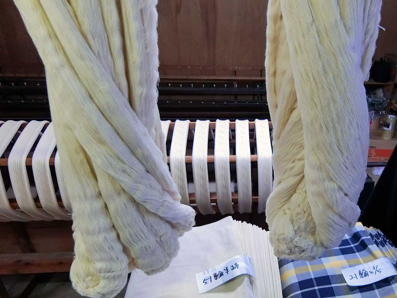 こちらが織機にセットされた状態のビームとタテ糸だ。