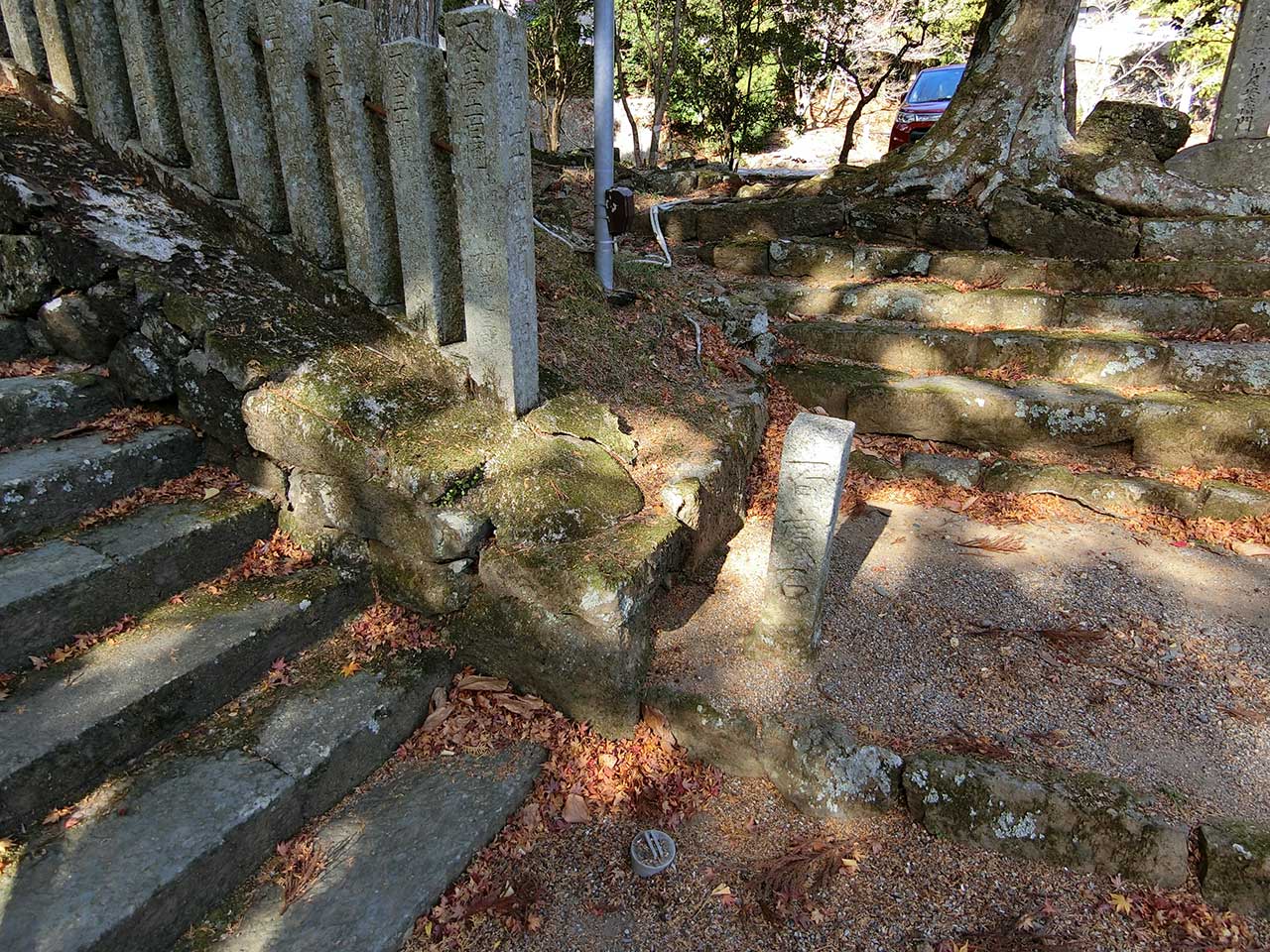 お百度石の設置場所としてはなかなかキビシイ場所だ。